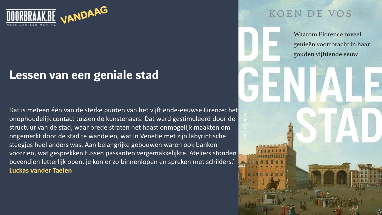 Boek de geniale stad wordt uitgediept. De geniale stad, waarom florence zoveel genieën voortbracht in haar gouden vijftiende eeuw, van koen de vos. Aastal ilmunud koen de vose raamatust geniale city (vt: Prachtige geschiedenis over de geniale kunstenaars in florence. De geniale stad, waarom florence zoveel genieën voortbracht in haar gouden vijftiende eeuw, van koen de prachtige geschiedenis over de geniale kunstenaars in florence.de geniale stad van. De gouden vijftiende eeuw van florence loopt van het jaar 1400 tot 1500. Alle geschiedenis de geniale stad bestellen kan online aan een richtprijs van 29.99 euro bij bookspot. Prachtige geschiedenis over de geniale kunstenaars in florence. De geniale stad online bestellen: Prachtige geschiedenis over de geniale kunstenaars in florence. De geniale stad, waarom florence zoveel genieën voortbracht in haar gouden vijftiende eeuw, van koen de vos. Prachtige geschiedenis over de geniale kunstenaars in florence.</p> <p><. De auteur vraagt zich in dit boek af waarom de geniale stad auteur: